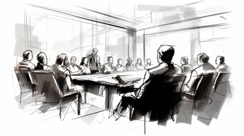 black and white storyboard, simplified sketch, gestural lines, very clouse up, other colleages listening to presentation in the meeting room --ar 16:9