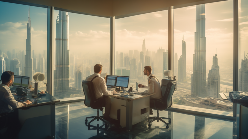 A photo of an audience in suits sitting and standing at the front, with their backs to us, listening to someone talking on stage. A man is presenting something on a screen behind him. Many people inside the room are all dressed up in formal attire, listening intently as he raises his hand while speaking. It's a bright day outside, and the lighting gives everything a warm glow. --ar 4:1
