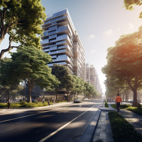 between two high rise podium , 60 feet road with both side happening retails, pedestrian friendly, roof for outdoor activities, slope gradient 1:15 road, with trees and beautiful modern landscape and streetscape, void to basement level for natural lighting and ventilation, hyper realistic , 4K resolution render