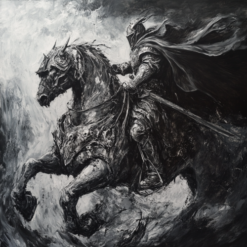 Oil painted surreal demonic war horse rider with a cape and helmet, riding a demonic horse . The armor is made of metal on the horse. In the style of Warhammer, in a fantasy setting, horror, dark, gross, evil, black and white
