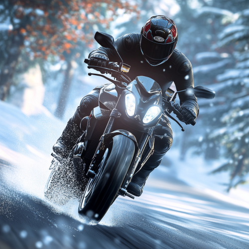Create a realistic and dynamic image of a motorcycle rider on a snow-covered road, where the motorcycle has started to slide on ice. The rider, dressed in winter riding gear and a helmet, is staying calm and keeping the motorcycle upright to maintain control. The background shows a cold, icy landscape with snow-covered trees and a frosty road surface. The focus is on the rider's steady posture, maintaining balance while the wheels of the motorcycle slightly skid on the ice, capturing a moment of tension and skillful handling.