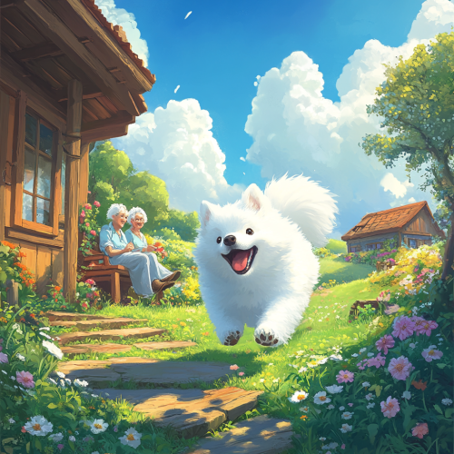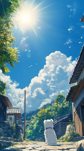 A white cute dog is leisurely spending time in a beautiful daytime scene of the Japanese countryside. The sun is shining brightly in the sky, creating a peaceful and picturesque atmosphere. The scene is depicted in Makoto Shinkai's anime style, with intricate details and vivid, beautiful colors. The scene feels dreamlike, with a calm yet powerful energy. --ar 9:16 --v 6.1