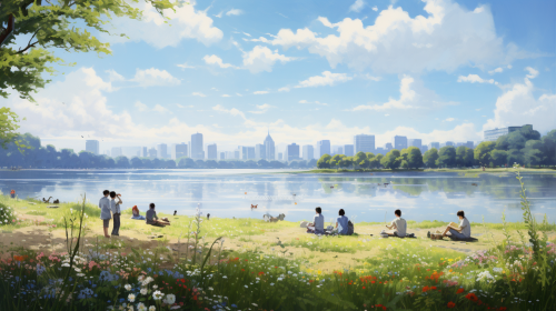 Han River, picnic, scenery, realistic pictures, mats, grass, peaceful atmosphere, clear sky, --ar 16:9
