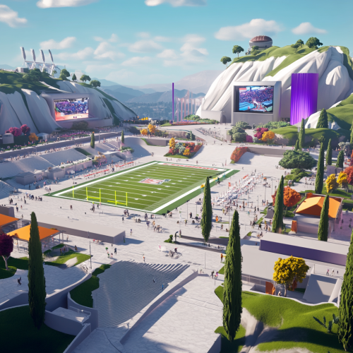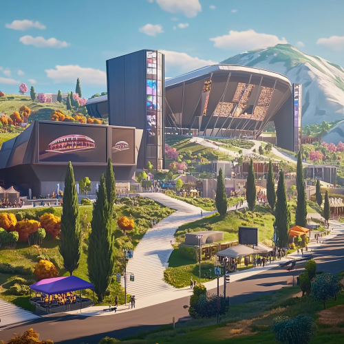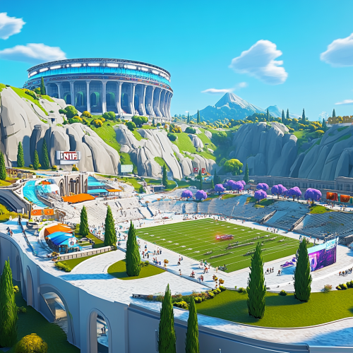 Roman inspired concert festival, modern building materials such as steel and glass, roman landscaping, italian cypress trees, white granite walkways, american football practice field, no stairs, only ramps, colorful tents, NFL themes,electronic signage, modern roman collegium inspired stadium on mountain in background, hillside, late afternoon, rendered in style of Fortnite