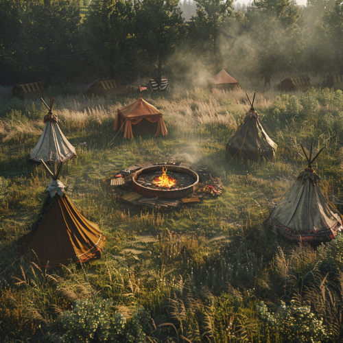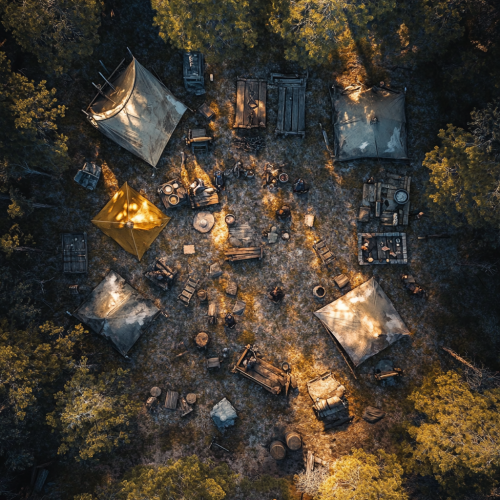 birdseye straight-down shot from a drone, battlemap floorplan photo of a medieval army camp in a forest with 200 tents. There are 4 mangonels, 5 canons on wheels and a covered battering ram resting in an area