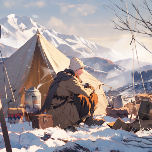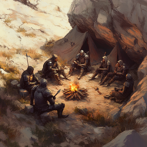 Roman camp on hill between mountains, legionaries in tents.
