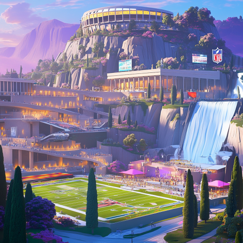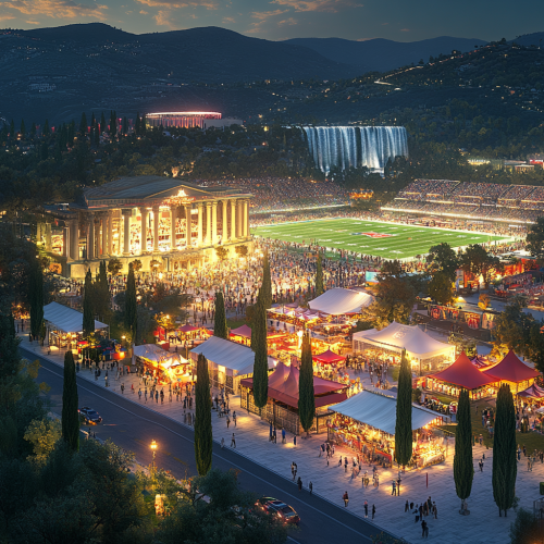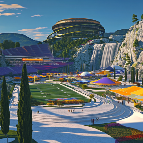 Roman inspired festival, modern building materials such as steel and glass, roman landscaping, italian cypress trees, white granite walkways, american football practice field, no stairs, only ramps, colorful tents, NFL themes,electronic signage, modern roman coliseum inspired stadium on mountain in background, waterfalls, late evening, rendered in minimal visual noise graphic style