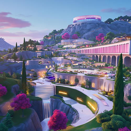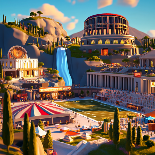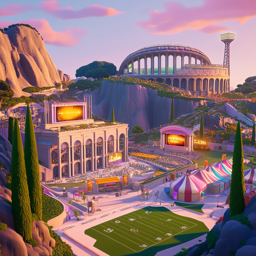 Roman inspired concert festival, modern building materials such as steel and glass, roman landscaping, italian cypress trees, white granite walkways, american football practice field, no stairs, only ramps, colorful tents, NFL themes,electronic signage, modern roman coliseum inspired stadium on mountain in background, hillside, late afternoon, rendered in style of Fortnite