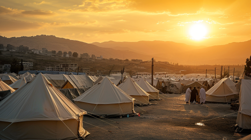 several Aid workers dressed in white setting up 3 family refugee tents in front of a mountainous and incredibly crowded refugee camp with thousands of modern flat-roof tents in the middle east just before sunset. all tents have flat roofs --v 6.0 --ar 16:9