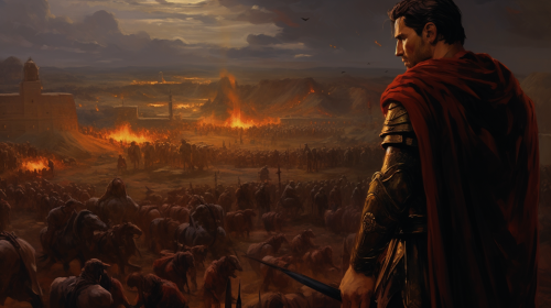 Ancient roman general from back, looking at military camp, Donato Giancola style concept art 8k