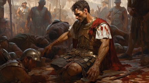 **Ancient Roman injured soldiers on front, they are in pain, Roman military camp on background. Donato Giancola style concept art --ar 16:9