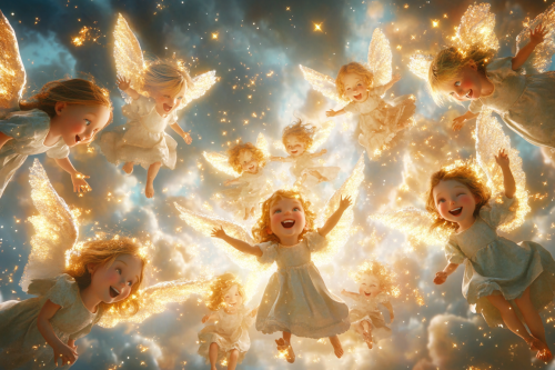 3d CGI animated image of the sky filled with angels smiling down as they send light to children, who are dancing and singing with joy, restoring light to the world, very detailed, bright colors, childrens book image, cinematic lighting, --ar 3:2