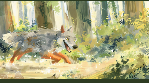 A storybook-style children's drawing of the Wolf running energetically along a forest path, his eyes focused ahead and a playful, excited grin on his face as he races towards Grandma’s cottage. The trees and bushes blur slightly in the background, emphasizing his fast movement. His soft, rounded fur and playful expression make him appear more mischievous than threatening. The scene is filled with vibrant colors, with soft shadows creating a dynamic, fast-paced mood --ar 16:9 --v 6.0