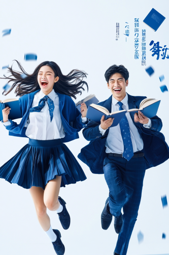 A promotional poster for the featuring characters from each part running towards us with an open book in their hands and smiling faces. The background is white and blue. There's also text that reads at top right corner. In front there should be two figures dressed as university students wearing uniforms, one male and another female, both laughing while they run together. They have books on hand and face showing happy expressions. Use professional camera settings to capture natural lighting and depth of field. --ar 85:128