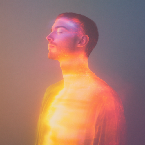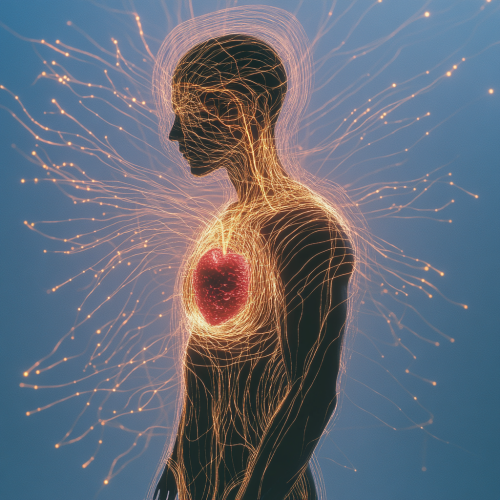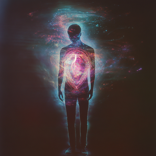 Ultra-realistic high-resolution photoshoot of a human figure standing with soft, serene expression, eyes closed, surrounded by a vibrant, gentle magnetic field radiating from the chest area. The magnetic field is visible as a translucent, radiant aura extending several meters around the body, with soft gradients in hues of warm red, gold, and subtle purples, symbolizing the heart's energy. Studio lighting captures intricate detail, creating a sense of depth and warmth. Background is neutral and slightly blurred to emphasize the glowing energy field.