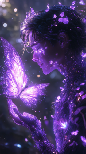 A glowing purple humanoid figure with ethereal, radiant wings stands gracefully, reaching out to gently interact with a glowing butterfly. The figure emits a soft, purple light, and the wings are wide and intricate, shimmering with translucent patterns. The butterfly also glows softly, hovering near the figure's hand, creating a scene filled with wonder and magic. The background is a dark, starry sky with subtle cosmic elements, such as distant stars and swirling energy, emphasizing the mystical and serene atmosphere. The overall image evokes a sense of playfulness, lightness, and spiritual connection. --ar 9:16 --s 750