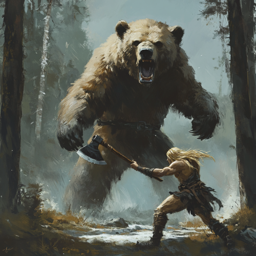 in the style of das schwarze auge, a tall blonde barbarian with a two-handed axe runs towards an angry tall bear on its hind legs, light forest in the background, land and bear have the same height