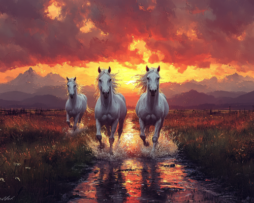 Create a picture in jackson pollok style, dynamic masculine painting style, it is a late evening after the rain, the sunset colors the sky slightly reddish and orange, on a narrow road beautiful white horses runs towards the viewer, mountains are visible in the distance, an artistic and creative piece, dynamic art style , --ar 46:37 --s 500