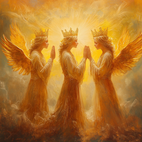 three celestial female angels bowing reverently and deeply, offering golden crowns in a heavenly and ethereal setting, in the style of christian religious art with a celestial, ethereal, and painterly, ar 8:5