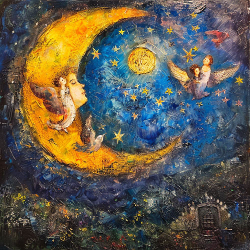 in the style of Marc Chagall celestial stars moon angels illuminated full of grace