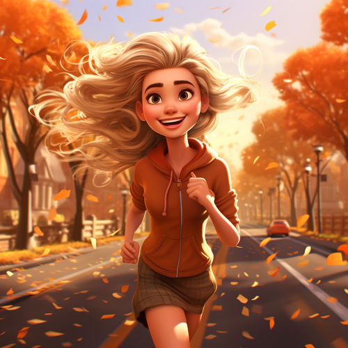 a happy running blonde woman running on a road in fall in style of pixar --s 250