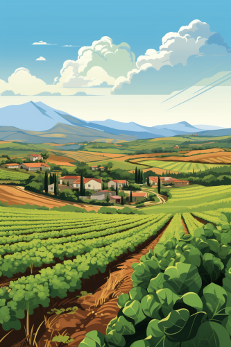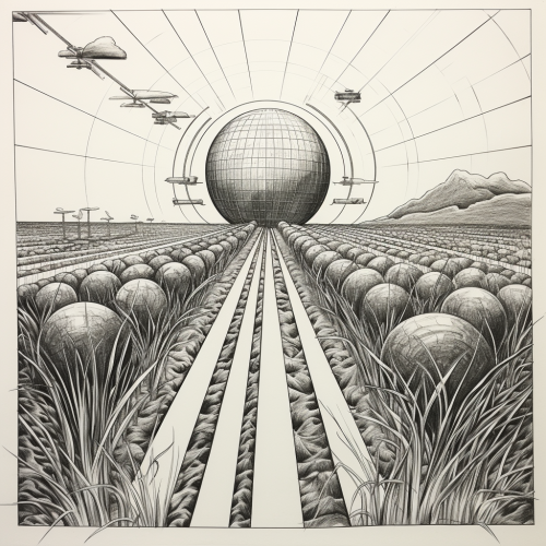 a storyboard sketch of an agricultural concept; a sphere is covered in parallel lines of crops