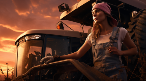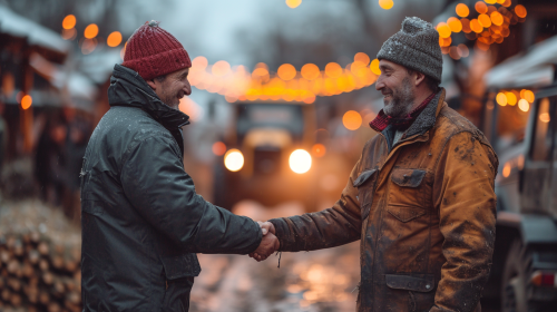 emotional handshake between a farmer and a truckdriver, a tractor and a truck in the background, urban enviroment, editorial shot, golden hour, cinematic lighting, dutch angle shot, vibrant colors --ar 16:9 --style raw --s 750 --v 6.0