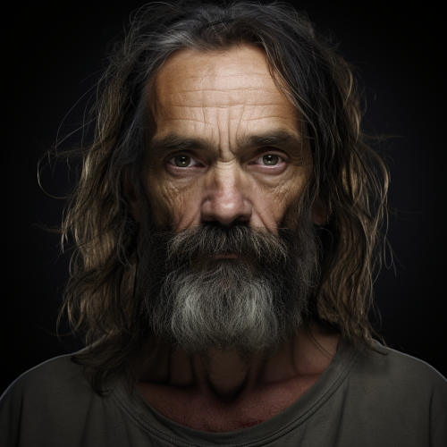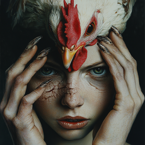 the face of a woman who has a chicken on her head and the chicken's paws are on her forehead, her claws are digging into the skin of her forehead, demon, portrait, realistic