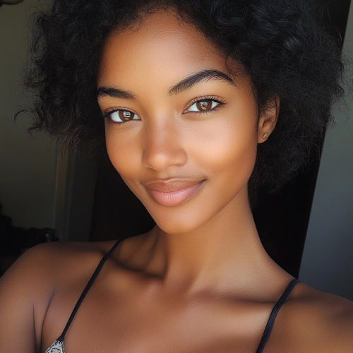 Selfie of a gorgeous black woman. She’s naturally beautiful with RICH BROWN SKIN, resembling the actress Megan Good. No makeup! A girl next door vibe. No smiling!
