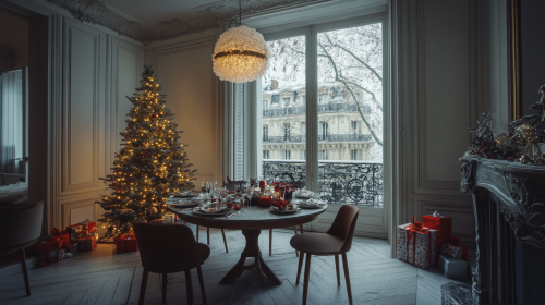 a luxurious parisian apartment designed by Charles Zana, snowy weather outside, a table set up for christmas, a beautiful christmas tree in a corner, some gift around --ar 16:9
