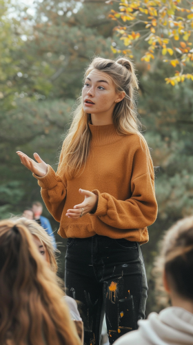 Photo of a young, robust 28-year-old woman with long hair tied back in the style of model Gigi Hadid and a round face, the woman is wearing an ocher-colored sweater and black pants with paint stains, the woman is giving a motivational talk to several people outdoors, detail in the hair and face of the woman who looks like the model Gigi Hadid, too much realism HD --ar 9:16 --v 6.0