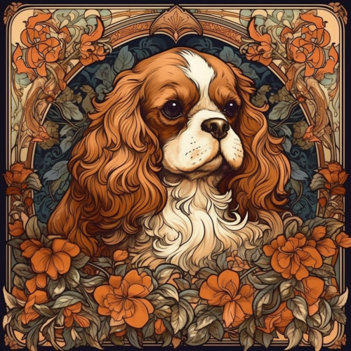 art nouveau portrait of a King Charles Cavalier Spaniel - very detailed and refined. Use the style of Alphonse Mucha using a fall palette of deep orange, scarlet, dark green, gold, and violet - use leaf patterns in the borders. --v 5.0 --s 750