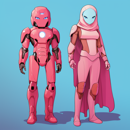 hijab megaman & ironman suit design look alike, pinkish color, full body, scifi, futuristic, simple minimalist, pixar style, concept art hand drawing.