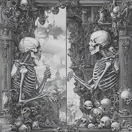 create a scene of life and death, death on the right and life on the left split by a horizontal line, baroque style, ornamental, skeletons, skulls, realism, cloth, fillagree, orniment, lots of figures.