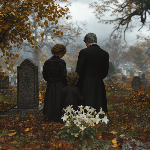 A small family mourning in a cemetery, 16:9 aspect ratio, hyper-realistic detail. Three figures - a man, a woman, and a young child - stand close together facing a simple granite headstone. They're dressed in crisp black attire, their heads bowed in shared grief. The woman's hand rests gently on the child's shoulder. Autumn leaves in shades of gold and burgundy scatter the ground around their polished black shoes. The cemetery stretches out behind them, rows of weathered headstones visible in the distance. Ancient oak trees with gnarled branches frame the scene, their leaves casting dappled shadows. The sky is overcast, with heavy grey clouds threatening rain, adding to the somber atmosphere. In the foreground, a bouquet of white lilies leans against the headstone, its petals captured in exquisite detail. Dewdrops cling to the flowers and nearby blades of grass, reflecting the muted light. The image has a muted color palette dominated by blacks, greys, and earthy tones, with occasional pops of color from the autumn leaves. Every texture is rendered in high definition - from the wool of their coats to the rough surface of the headstones and the bark of the trees. The lighting is soft and diffused, creating subtle shadows that accentuate the contours of the mourners' faces and the undulations of the cemetery grounds. The overall mood is one of quiet sorrow and reflection, captured in breathtaking, lifelike detail.