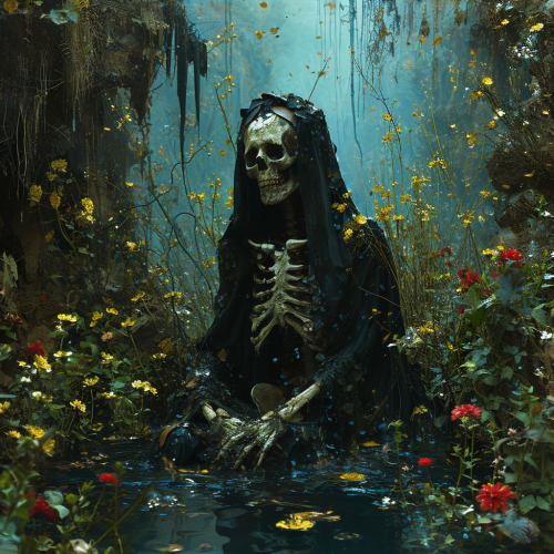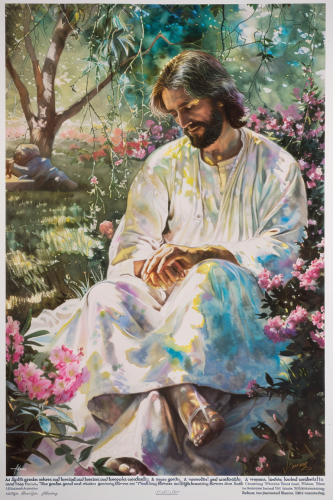 "An idyllic garden setting where God, depicted as a serene and benevolent figure, is seated comfortably. A woman, looking peaceful and content, rests gently in His lap. The garden is lush and vibrant, with blooming flowers and gentle sunlight filtering through the trees, creating a tranquil and harmonious atmosphere. The scene conveys a sense of divine comfort, nurturing, and serenity, capturing the tender and protective presence of God as He offers solace and care." --v 6.0 --ar 2:3
