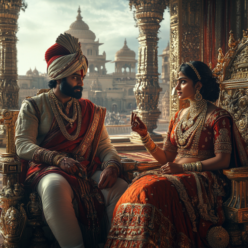 Queen Lakshmi Bai, seated on a throne beside her husband, the ruler of Jhansi, looking pensive as they discuss adopting a child, with intricate royal attire and a grand palace setting. hyperrealistic, cinematic, 8k