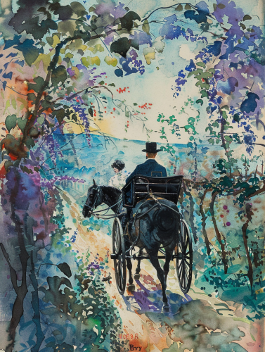 a carriage, an older man steers a horse, a young woman is behind the carriage, 19th century, winding road, vines, spring, vivid colors, details, watercolors, --v 6.0 --ar 3:4
