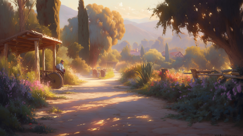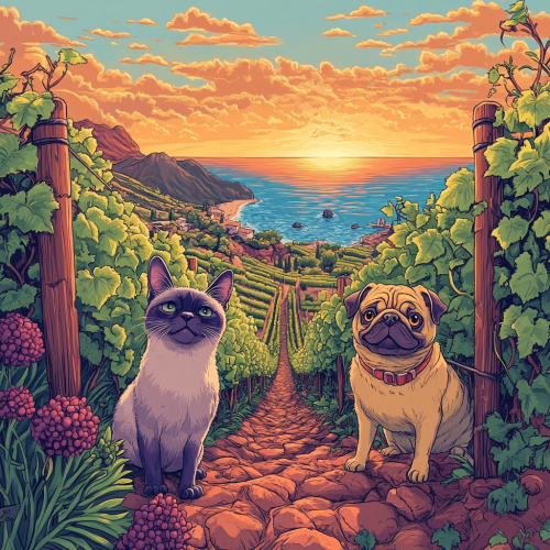 Immerse yourself in the vibrant palette of a California vineyard, where nature's canvas unfolds in a symphony of colors. Picture sprawling grape fields adorned in hues of rich green, their vines weaving a tapestry across the land. The sun, a masterful artist, bathes the landscape in warm golden tones, casting a luminous glow upon the ripe clusters of grapes. As you gaze upon the vineyard, the sky above is a breathtaking canvas of blues and purples, adorned with wisps of cotton-like clouds that stretch across the horizon. These clouds, like fluffy brushstrokes, add depth and drama to the scene, creating dynamic patterns of light and shadow that dance upon the grape leaves. The grapevines themselves are a study in contrasts, with deep emerald leaves providing a lush backdrop to the clusters of plump, sun-kissed grapes. Each grape, a miniature masterpiece, displays a spectrum of colors ranging from ruby reds to amethyst purples, creating a visual feast for the senses. As you stand in the midst of this living artwork, a gentle breeze carries the sweet aroma of ripening grapes, creating a sensory symphony that complements the visual splendor. The air is filled with the harmony of nature – a melody of rustling leaves, distant bird songs, and the occasional soft murmur of the wind. This AI-generated painting invites you to lose yourself in the kaleidoscope of colors, textures, and scents that define the enchanting beauty of a California vineyard. It is a masterpiece crafted by both nature and imagination, a celebration of the artistry inherent in the cultivation of grapes beneath the expansive canvas of the California sky. --ar 16:9 --niji 5 --s 750 --style scenic