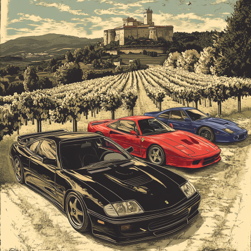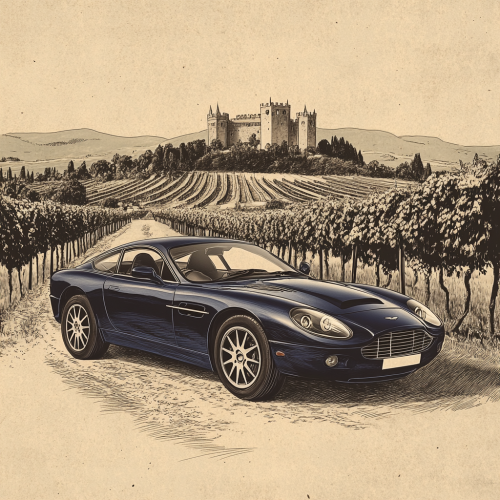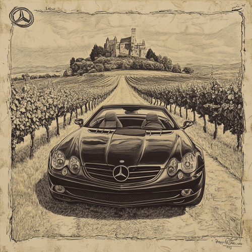 A vintage drawing in high detail of a deep black Mercedes-Benz SL600, viewed from the front with a bold, aggressive stance. The car’s intense black color contrasts strikingly against the sepia-toned background, making it stand out vividly. Set amidst a vineyard, rows of grapevines stretch back toward a majestic castle on the horizon. The image has jagged, rough edges, resembling a torn, weathered photograph. The deep black of the SL600 commands attention against the warm, muted sepia tones of the vineyard and castle, creating a dramatic, timeless scene.