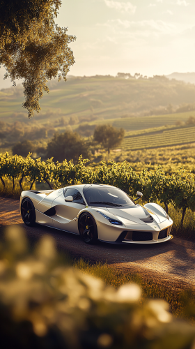 A luxurious white Ferrari LaFerrari positioned in a picturesque vineyard during the golden hour. The car’s stunning design contrasts beautifully with the lush green grapevines and rolling hills in the background. Soft sunlight bathes the scene, creating an atmosphere of serenity and opulence that emphasizes the beauty of the car and its surroundings. Photorealistic, ultra-detailed with vineyard backdrop, 8K resolution --ar 9:16 --v 6.1 --style raw