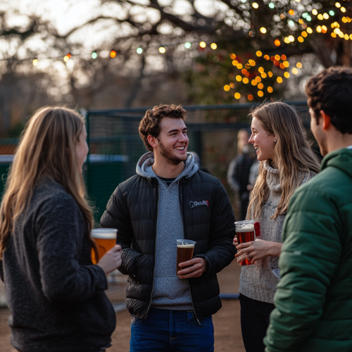 Wide shot, f/2.8, 16–35mm lens, candid snapshot of a group of young, attractive people in their mid-twenties, reuniting for a homecoming celebration at a padel or pickleall court. The group, who looks like they've attended Yale, University of Texas, and UVM, is dressed casually in the classic Vineyard Vines style--layered up for a reunion game of padel. They outside a warming hut near a padel court enjoying a holiday darty (daytime party) with beer and hot toddy in hand, laughing and catching up. Festive christmas lights adorn the trees background where you can also see the padel court, adding holiday cheer. It’s a bright, sunny winter day, capturing the lively, carefree energy of the moment. Shot in the style of Bruce Weber with an all-American, hyper-realistic vibe. 33mm, 3:2 aspect ratio, chaos 0 for a natural, joyful feel.