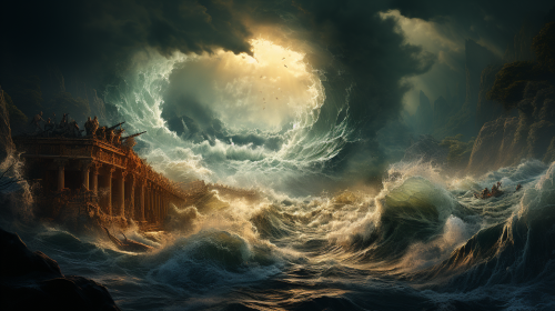 A natural disaster, a flood, a tsunami, a huge tidal wave, violent streams of water at breakneck speed rush into the city destroying everything in its path, high resolution, ultra quality, high details, photorealism --ar 16:9 --s 750