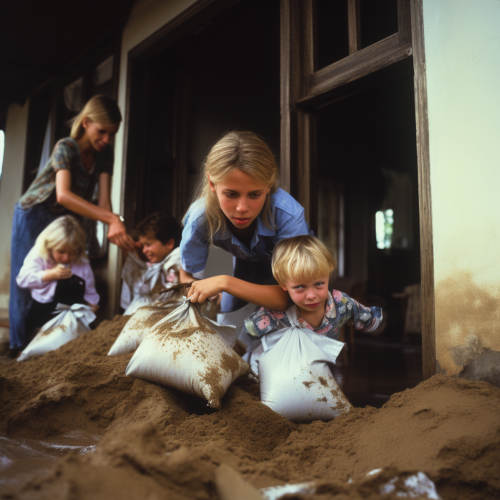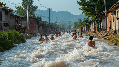 high altitude side view of a raging flash flood in a wide rural river with people being pushed downstream at high speed in the floodwaters, they are up to their chests and necks in water, holding onto each other, fearing for their lives, early afternoon, bright sunlight and blue sky --ar 16:9 --q 2 --s 750