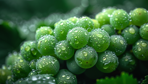 In the image, intricate details of green grapevines adorned with dewdrops come to life. The photograph captures the essence of realism and nature in a macro perspective, allowing viewers to immerse themselves in the intricate beauty of the vineyard. Each dewdrop glistens like a miniature jewel, delicately clinging to the surface of the vibrant green grapes. The meticulous attention to detail brings out the texture of the grapevine leaves, while the dewdrops add a touch of freshness and vitality to the scene. This photograph transports viewers into the heart of the vineyard, where they can appreciate the natural wonders that adorn the landscape. --ar 7:4 --stylize 850 --v 6.0
