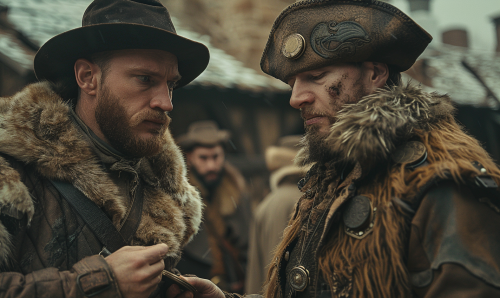 cinematic gaussian blur scene from a movie men wearing furs and leather exchanging coins --ar 5:3