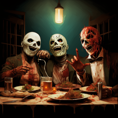 design me an image of Jason, Michael Myers, ghost face from scream and Freddy Kruger all having fun at dinner.