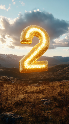 a huge gold number 2 floating in mid air while glowing brighter than sun in a field of grass and hills, mountains landscape in the distance partly cloudy, --ar 9:16
