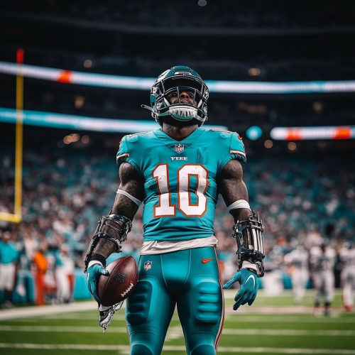 tyreek hill standing in the end zone of a football field, his jersey color is teal, his jersey number is 10, holding a football, he is wearing shackles