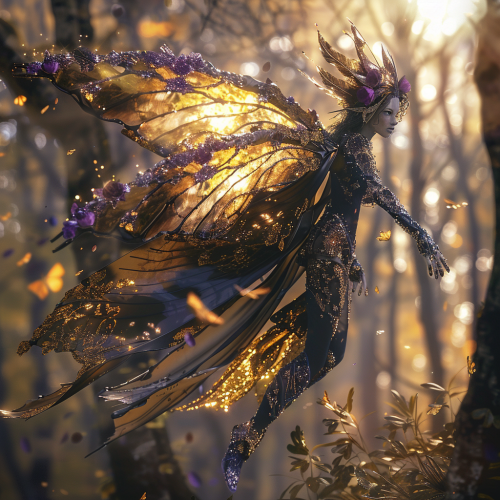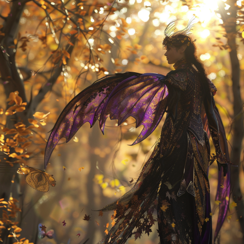 /**wide angle view, Full body view, autumn colors, nebulas and galaxies, ambient lighting, Beautiful AI fairy with black and gold shimmering dragon wings, flowers in hair, sunlight hitting her purple and gold intricately designed elvish Bodysuit with cape flying, brown hair, cinematic shot, twisted trees, dramatic sunbeams, forest, birds flying, photorealistic, cinematic lighting, depth of field, renaissance painting. cyberpunk, vibrant, stunningly beautiful, crisp, detailed, high contrast, cinematic, ultra detailed, in the style of yoh nagao, Nikon, hyper realistic, highly detailed, depth of field high definition, 4k, light-focused stylize 750 --v 6.0